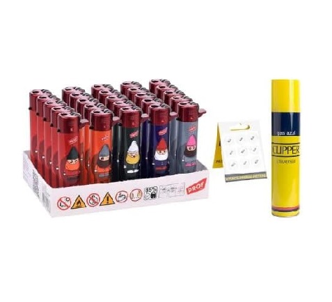 Pack 25 Uds. Mechero Encendedor Redondo Recargable con Piedra recambiable + Pack DE 2 Clipper Gas ISOBUTANO 300 ML para MECHEROS Exclusivo de DISPAU