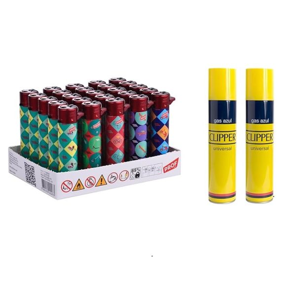 - Pack 25 Uds. Mechero Encendedor Redondo Recargable con Piedra recambiable + Pack DE 2 Clipper Gas ISOBUTANO 300 ML para MECHEROS Exclusivo de DISPAU